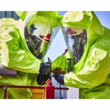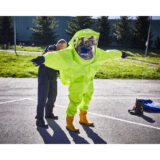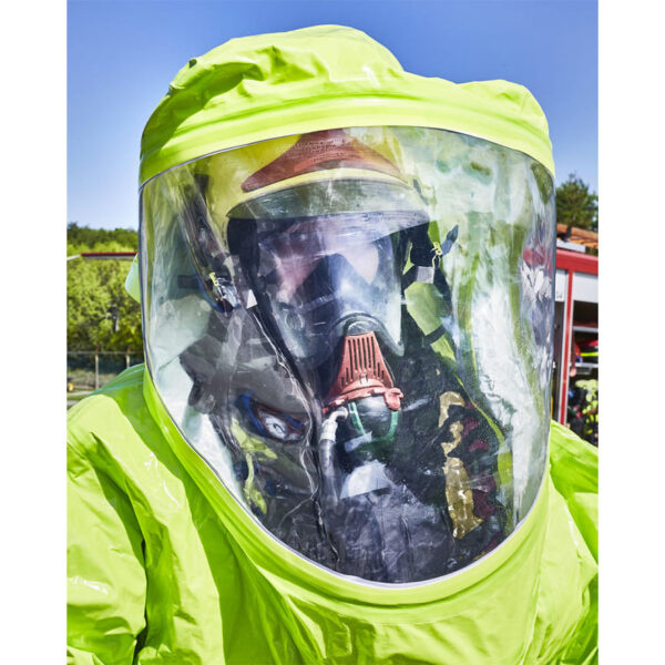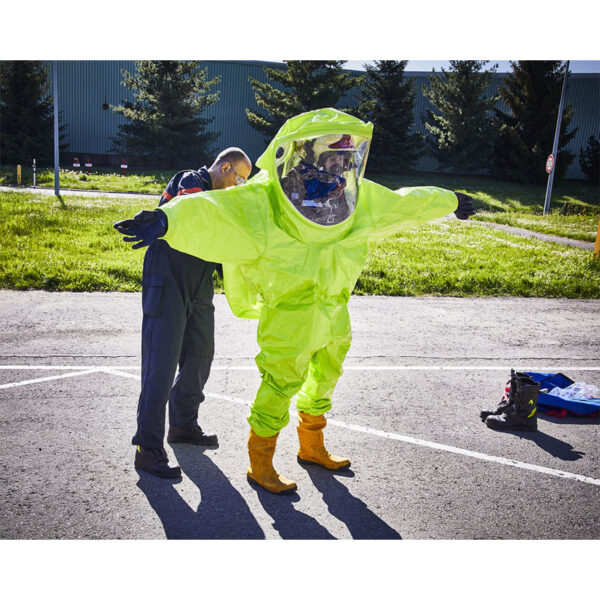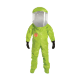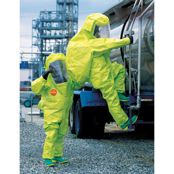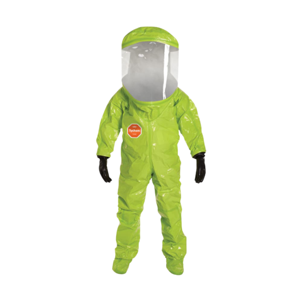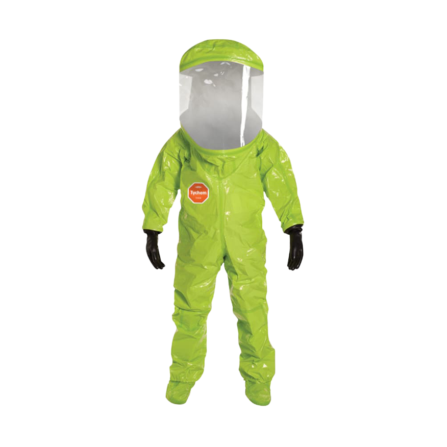 DuPont™ Tychem® 10000 traje encapsulado Nivel A. Traje certificado por el NFPA 1994, Clase 2. Espalda expandida, entrada por el frente. Visor extra amplio, 3 capas: 40 mil PVC / Teflon® 5 mil / 20 PVC mil. Guantes incluido, interno: laminado de multi-capa / externo: Neopreno. Calcetines incluidos con solapa externa. Solapa doble con cierre de felpa y gancho. Dos válvulas de escape. Costuras termoselladas dobles. Amarillo Lima.